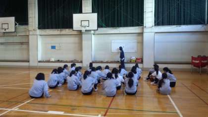 左の写真は、1年生女子の保健体育で、バスケットボールの授業です。本時の目標は「守る」ことでした。実技の合間にホワイトボード前に集合して、目標や実技のポイントを話し合っているところです。