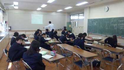 右の写真は、1年生の理科(少人数)です。バネの力についての授業で、黒板とICTを組み合わせて授業を進めていました。