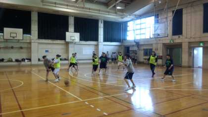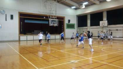 写真は男女バスケットボール部の練習です。明日は冬季大会があると聞いています。男子の方には、本田副校長先生がコーチに入り、ディフェンスの指示を出していました。