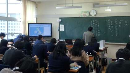 写真左は国語の授業です。大型テレビに作者の出身地であるイギリスが提示されています。このように、作品の背景を知って読んでいくことも、読みを深めるポイントです。