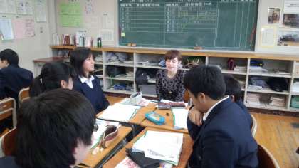 写真左は、1年生の英語(少人数)です。ALTのキャサリン先生を囲んで、英語で楽しそうに会話をしています。ALTと直接かかわる時間が増えるのも、少人数授業の良いところです。