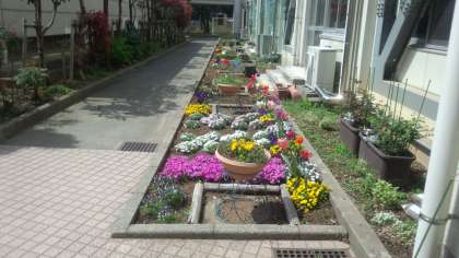 昨年度の終わりに、学校主事の方や栗山先生たちとボランティアの生徒の皆さんで植えたパンジーも元気に咲いています。