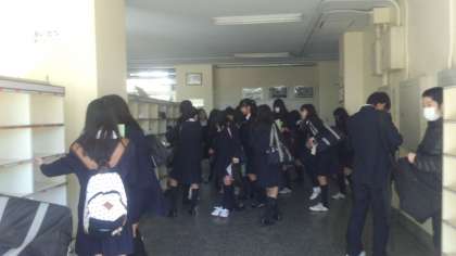 写真左は、新しいクラスの下駄箱の様子、右は始業式終了後の様子です。