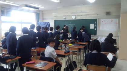 1Cは、小嶋先生がクラスで大事にしてほしいことを話しているのを、生徒の皆さんは静かにしっかりと聞いていました。1Dは、回収するものを集めていました。