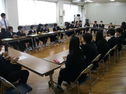 生徒協議会には、生徒会本部役員6名をはじめ、各専門委員会の委員長・学級委員が集まり、各委員会や各学級からの報告と月間目標について話し合いました。
