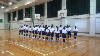 写真中央は1年生女子の保健体育です。号令のかけ方など、集団の動きを練習しています。これは体育の基本で、運動会の時も大切ですね。