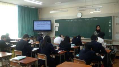 写真右は3年生の英語(少人数)です。デジタル教科書を使って授業を進めています。