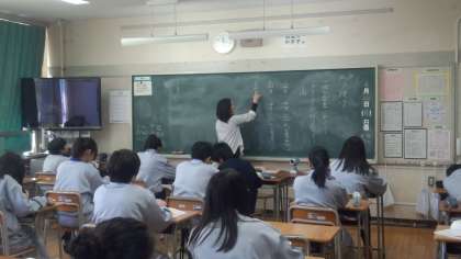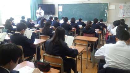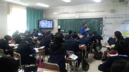 写真右は3年生です。大型テレビに場面絵を映しているところがさすがです。生徒も意見を活発に発表し、たいへんよかったです。