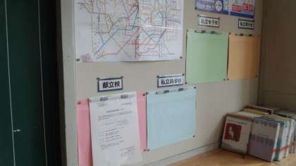 写真中央は、3年生の各クラスに掲示してある進路情報コーナーです。都立高校も私立高校も5月から授業参観や説明会を組んでいるところがありますので、大切なコーナーです。早めに高校を見学しておく方がよいですね。