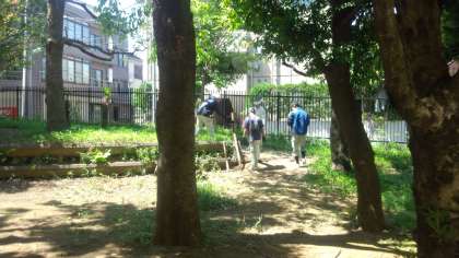 写真右は、駒沢中のシンボル「タンチ山」です。今日からタンチ山に遊歩道を作る工事が始まりました。完成が楽しみですね。