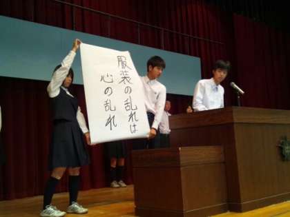 その中で、生活委員会が「服装の乱れは心の乱れ」と書いた模造紙を広げ、