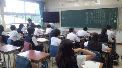 左の写真は、教育実習生の1年生国語の授業です。