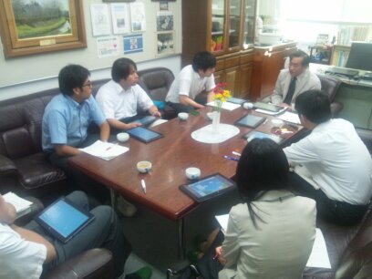 授業研究、東原先生の講義の後も本校のICTリーダーが東原先生からタブレットPCの活用について勉強していました。