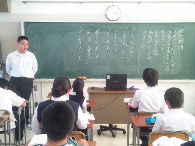 保健体育はバレーボールでした。まずネットの張り方、ボールに慣れることから始めていました。2年生の国語は平家物語の音読でした。生徒たちはとても大きな声で上手に音読していました。1年生の国語は竹取物語でした。誰もが知っている昔話を古文の仮名づかい等を使って、古文風に作り直して発表していました。