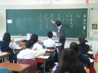 国語では、「故事成語」を学習していました。漢文の読み方の順番に悪戦苦闘していましたが、途中から「わかった。」「簡単だった。」という声がたくさん聞こえるようになりました。(副校長)