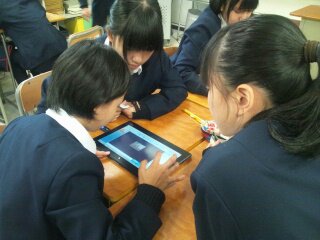 本日の授業でも、タブレットPCを使って、自分たちで撮影した画像やタイトル、キャッチコピーなどを編集していました。