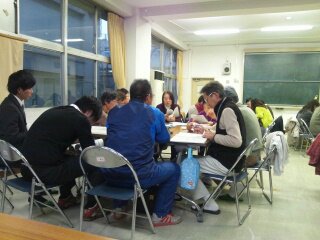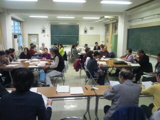 町会やまちづくりセンター、区役所、PTA役員の方々と担当教職員あわせて40名以上が集まり、避難所運営について話し合いました。