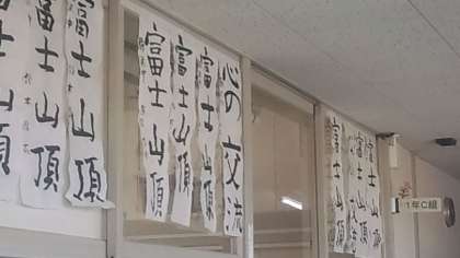 写真右は1年生の廊下です。書き初めが整然と掲示されています。一人ひとりの字を見ていると、個性がよく表れていると思いました。