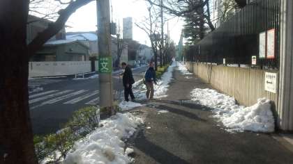 先週降った雪が通学路に残っています。朝、副校長先生と佐藤学校主事さんが、生徒の皆さんと歩道を通る方々の安全確保のため、スコップで雪かきをしてくださっています。
