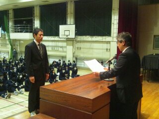 西川先生は2年間にわたるICTの研究の中心としてがんばり、数学においてもよりよい授業を行うため、日々研究に取り組んでいるので、世田谷区から表彰されました。(副校長)