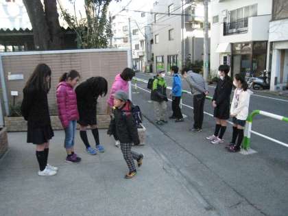 本校の生徒と児童が一緒にあいさつしました。(副校長)