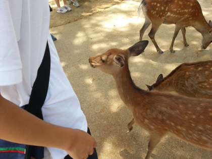 奈良公園名物の鹿とたわむれています。かわいいですね!
