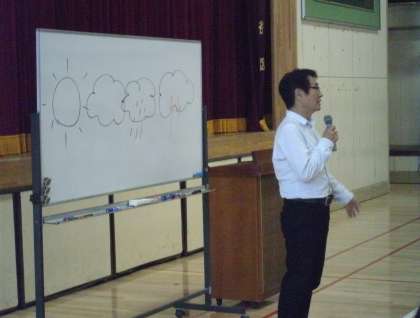 「晴れ、曇り、雨、雷。それぞれどんな気持ちを表すと思う?」と講師の方がホワイトボードに絵を描き、1年生に質問をしました。「晴れはhappy!」「曇りは、もやもやした気持ち」とたくさん意見を出して積極的に参加していました。DV(Domestic Violence; 家庭内暴力)についても勉強しました。「みんなで協力すればいじめはなくせる」という言葉とともに、ここで学んだことは今後の学校生活でもきっと役に立つと思います。(副校長)