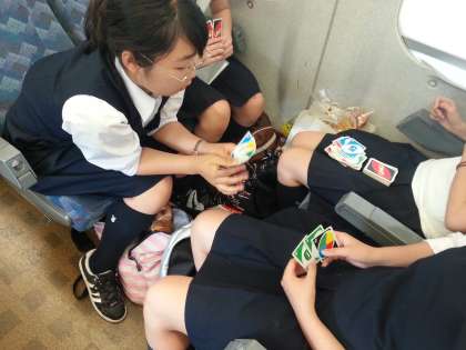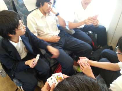 生徒たちはまだまだ元気な様子。色々なカードゲームで遊んでいます。(加藤涼)