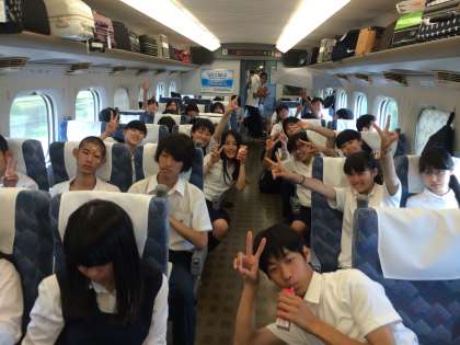 「帰りたくな〜い」という生徒もいれば「早く帰りたい」と、疲れた様子の生徒もいますが、新幹線の中ではみんな元気いっぱいです。(坂本)