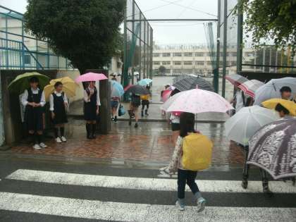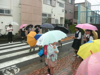 6月12日に、生徒会本部役員とJRC部で弦巻小学校に訪問し、あいさつ運動を行いました。雨の降る中でしたが、中学生も小学生も気持ちのよいあいさつを交わしていました。(曽根)
