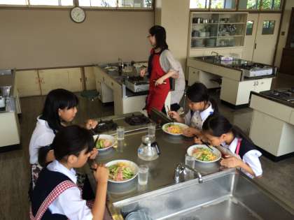 家庭科室を覗くと、家庭科部がみんなでお昼ご飯を作っていました。