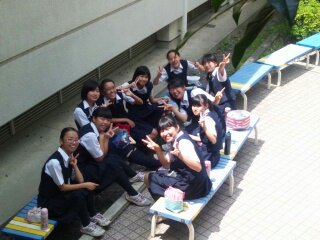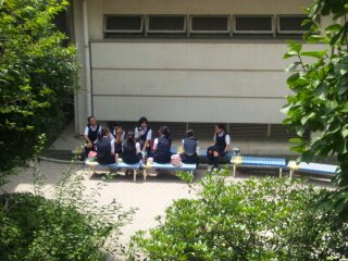 中庭で、吹奏楽部の3年生が談笑しながらお弁当を食べていました。