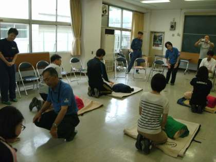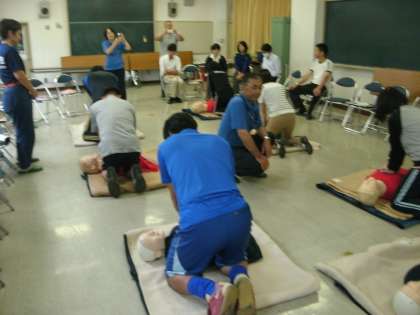 実際に事故が起きた時、どう対応したらいいのか、頭の中でシュミレーションしながら一人一人の教職員が真剣に受講し、実技の練習もしました。事故の予防も大切ですが、実際心肺停止の人に会った場合にすみやかな対応をするためにも、救急救命講習会は欠かせません。(菅野)