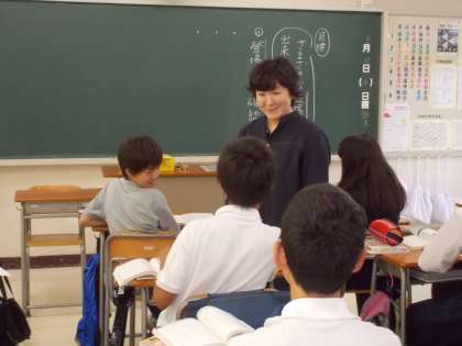 授業のはじめの漢字テストも生徒の意欲を引き出すような声かけを一人ひとりにしていました。(副校長)