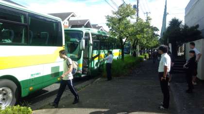 出発式の後、バスに乗り込み、中央高速道路(予定では東名でしたが)を通って河口湖へと向かいます。