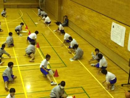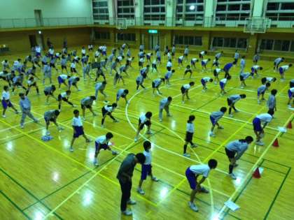 準備運動です。みんなレク係の指示に従って動いています。レク係になった生徒は頑張っています!