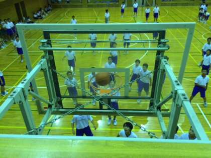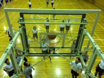 まずはバスケットボールです! 女子A組対B組、男子C組対D組です。ナイスシュート!