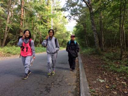 各班それぞれ個性がありますが、みんな楽しんでいるようです。コンパスと地図を手に、こんな林の中を入っていきます。(森川)
