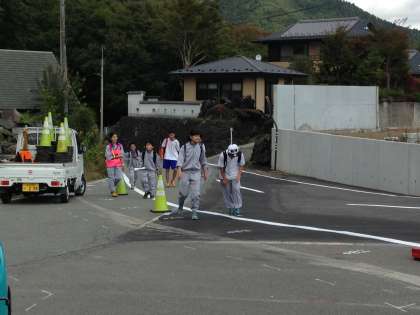 このような横断歩道の横で待っています。先ほど、トップで走り続けているB組3班が通過しました。次の班がなかなか来ず、寂しいですが、遠くから生徒の声が聞こえると嬉しくなります。ゴールまであと少しです。(小嶋)