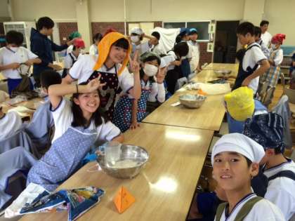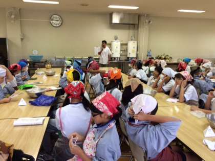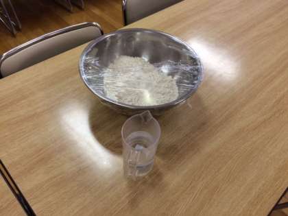 これからうどん作りです。今日の夕飯の一部になります。みんなそれぞれのエプロンと三角巾を着用して準備万端です。(森川)