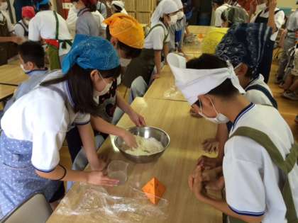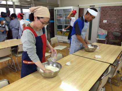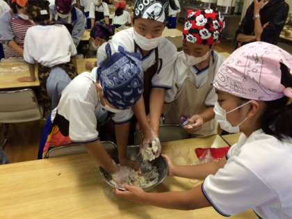 始まりました! 楽しそうにこねています。かなり適当な班もいそうですが・・そんな中技術家庭科の先生方も腕を振るいます。(森川)