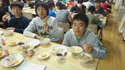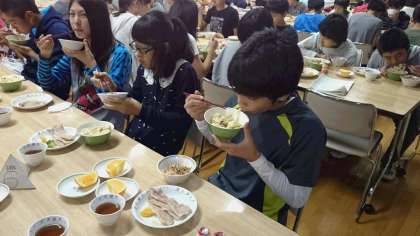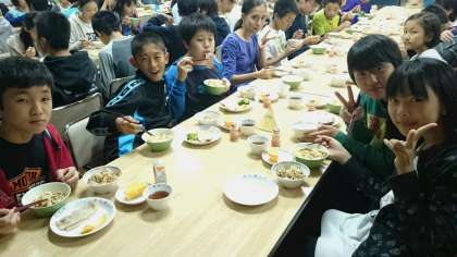二日目の夕食の時間です。自分たちでつくったうどんを美味しそうに食べています。(副校長)