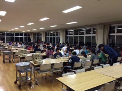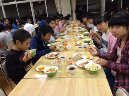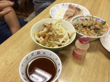 今日の夕飯は、作ったうどんと炊き込み御飯、お肉とオレンジです。うどんは美味しく作れました!(森川)