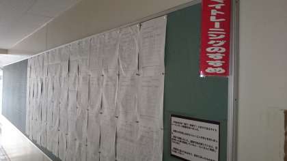 3年生の女子が体力テストの結果をもとに体育の授業で考えたマイトレーニングが掲示してあります。