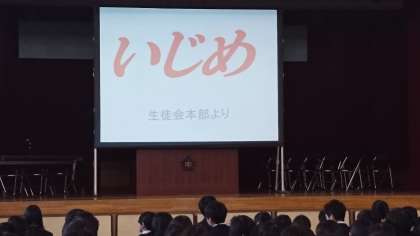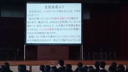 本日、生徒総会に引き続き、生徒会主催の「いじめ防止集会」を行いました。