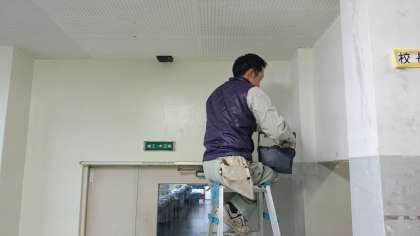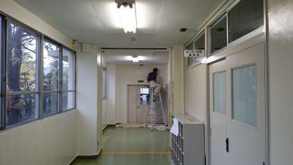 次年度から開設するあじさい学級の前の廊下の壁を学校主事さんが塗り直してくれています。教室等の室内と教室側の壁はとてもきれいなので、窓側の壁も負けないくらいきれいにして、生徒を迎える準備をしてくれています。(副校長)