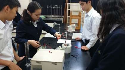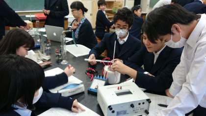 2年生が「電圧を変えたときの水の温度変化を調べる」実験を行っていました。