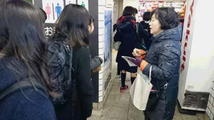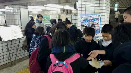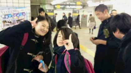 本日は1年生の校外学習です。駒沢大学駅でチェックを受けています。みんな期待に胸膨らませています。(副校長)