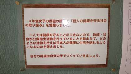 3年生女子の保健の授業で「個人の健康を守る社会の取り組み」をレポートにまとめました。体育館の入り口の廊下に掲示してあります。