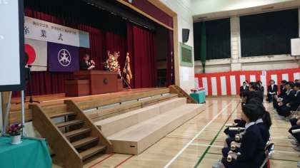 「春(はる)風(かぜ)が吹き、中庭のモクレンが白い花を咲かせると、駒沢中学校にも、「旅立ちの時」が訪れます。一三二名の卒業生の皆さん、ご卒業おめでとうございます。本校の教職員と在校生を代表して、心からお祝いを申し上げます。